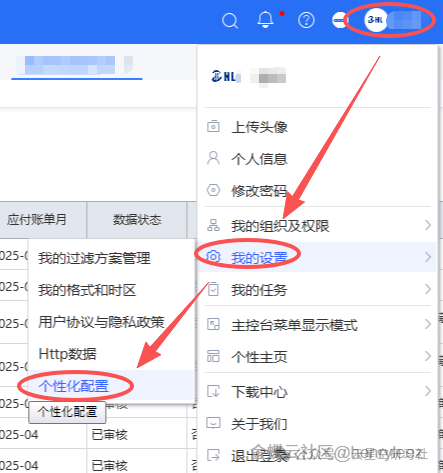 个性化参数配置路径:【右上方个人头像】→【我的设置】→【个性化配置】,如下图3:图3