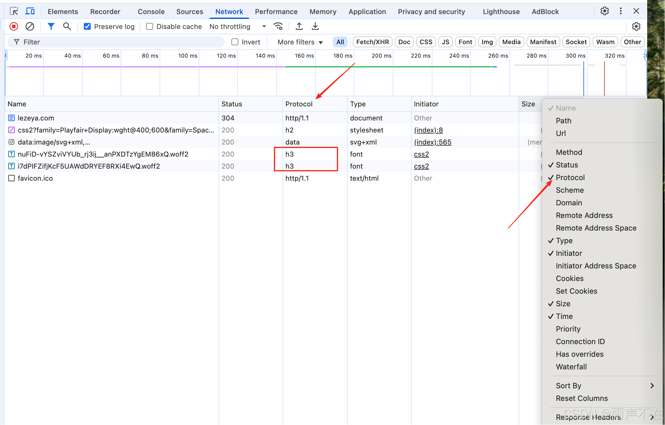 More tools -> developer tools -> network -> protocol