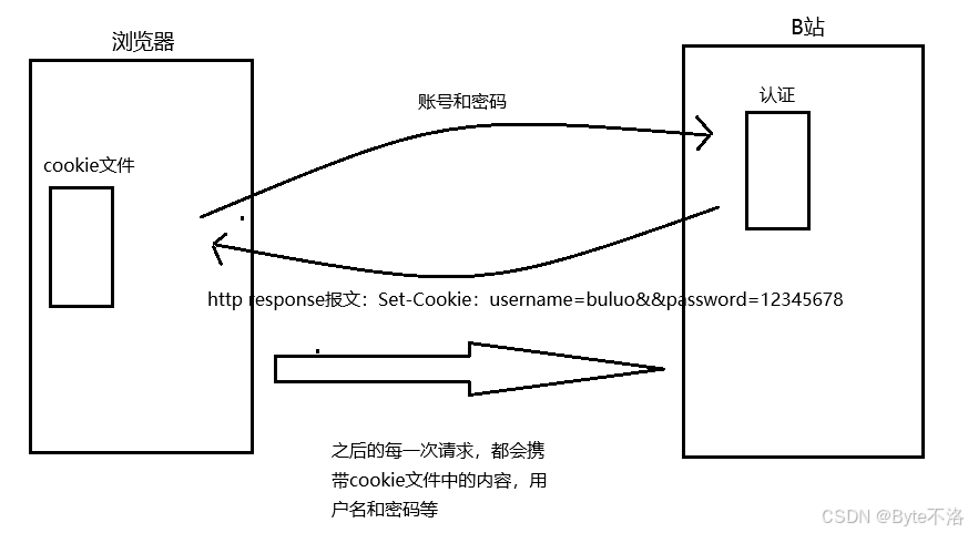 现在我们通过生活中的例子进行理解cookie,相信大家在网页中登录B站,或则腾讯视频等等网页的时候,一般都需要我们进行账号登录,我们完成账号登录之后就可以对其进行访问了,但是当我们访问完成之后,将其关闭,在一段时间内如果我们重新登录,我们就不需要再进行账号登录,可以直接使用,这是怎么做到的呢,这其实就是HTTP会对登录用户的会话具有保持的功能,具体情况就是如下:
