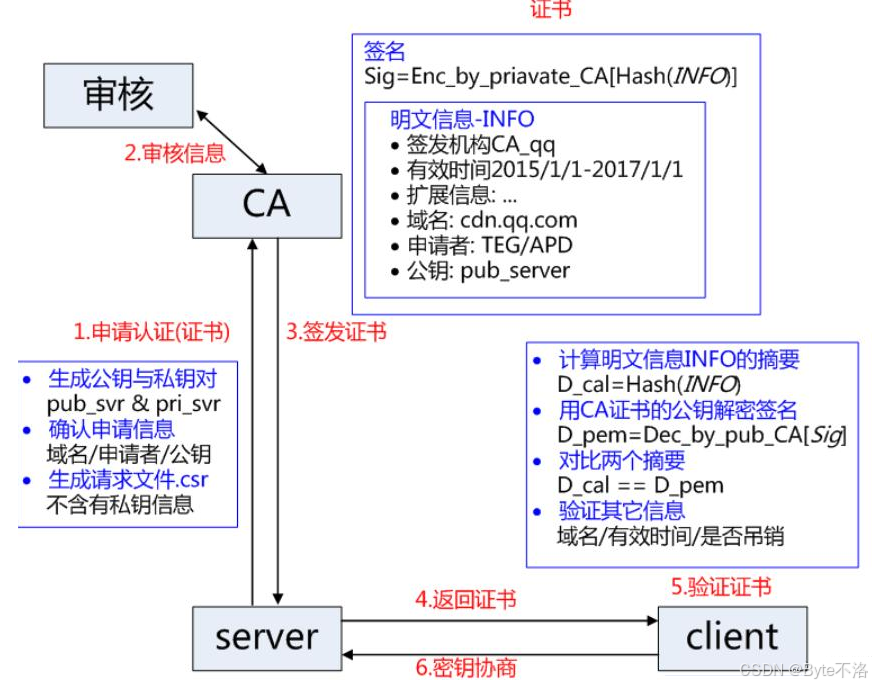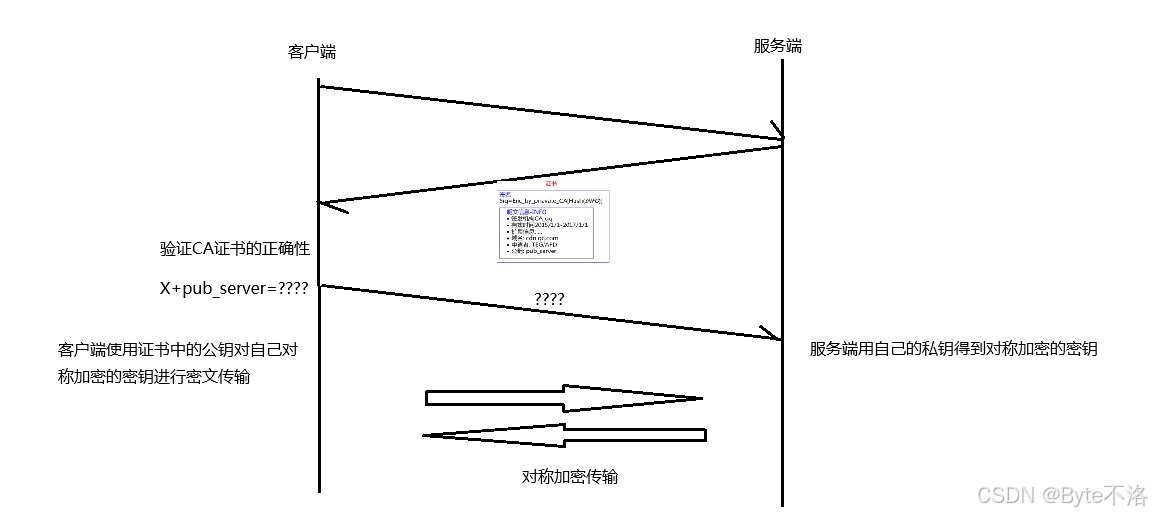在客户端和服务器刚建立连接的时候,服务器给客户端返回一个证书,证书包含之前服务端的公钥,以及一些身份信息,以及数据签名,客户端在拿到CA证书之后,验证CA证书的合法性,验证成功之后,将使用证书中的公钥对自己接下来要使用的对称加密传输的密钥进行密文传输,然后服务器拿到这个密文之后,使用自己的私钥进行解密,得到对称加密的密钥信息,之后客户端和服务器就可以进行对称加密方式的信息传输。