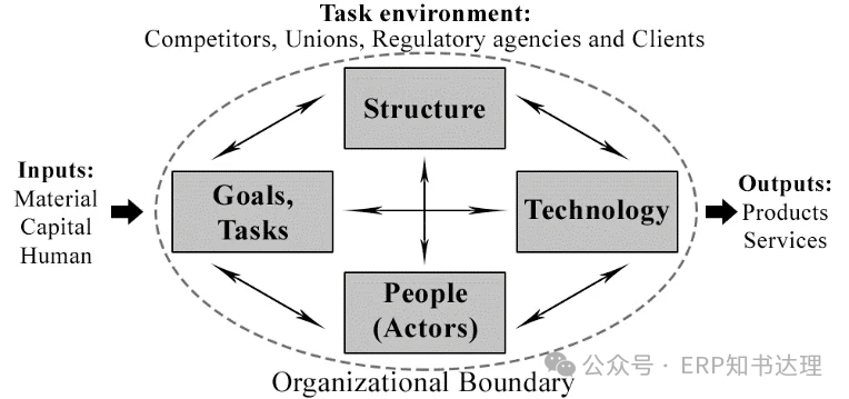 这个模型最早出现在莱维特的《组织变革手册》中。他认为,任何一个组织或系统都由四个紧密咬合的部件构成: