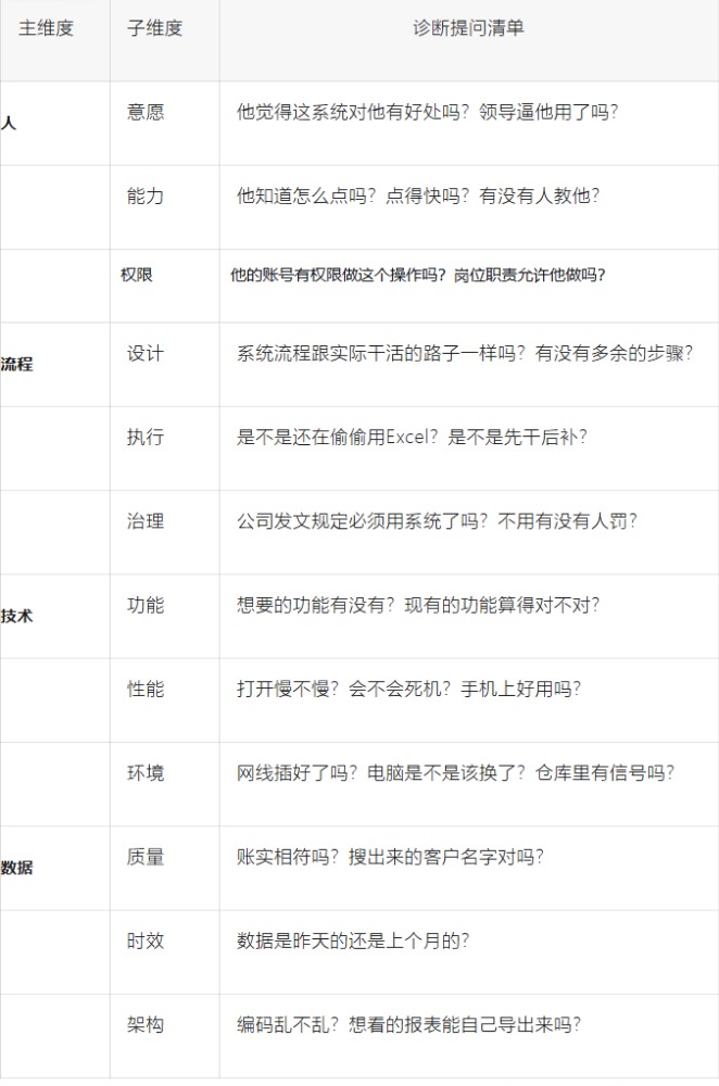 现在,我们把所有维度汇总成一张快速筛查表。下次客户说“系统没用起来”,你可以一边听,一边在心里默默过一遍这些问题:
