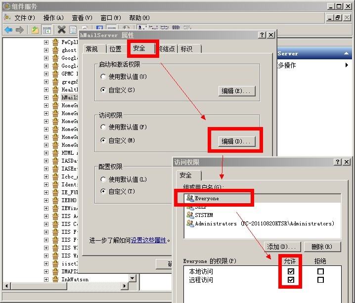 hMailServer的组件权限要也要设置成everyone或IIS来宾权限。服务器组件权限修改:Windows开始-->控制面板-->管理工具-->组件服务-->计算机-》我的电脑-》DCOM配置-》HMailserver组件,右键:“启动和激活”与“访问权限”项自定义增加everyone或IIS来宾权限。