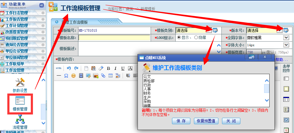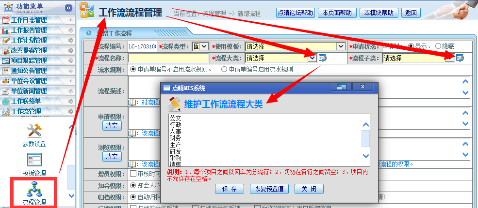 新增或维护模板及流程页面,注意类别后面有一个设置图标,点击图标,就可以维护类别了: