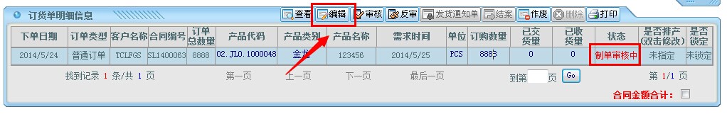 情况一.在单据未审核前提下修改单据。 操作如下:销售管理——销售订单管理——订货单明细管理 直接点击页面的编辑按钮如图:
