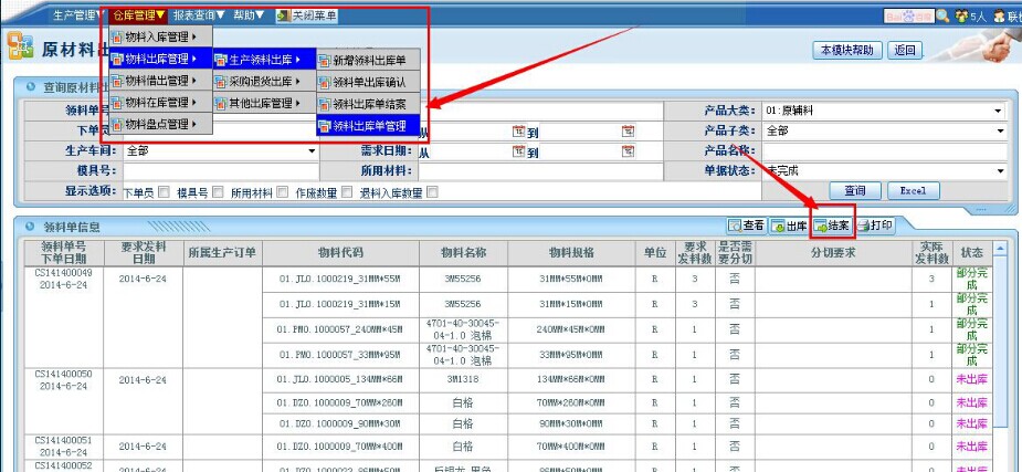 情况 仓库在新增领料出库单时填写数量出错,导致系统需求出货数量与实际出货数量不符,造成单据不能结案:如下图 解决方法 直接将此出货单结案即可,如下图 最后查询单据显示状态如下图所示: 点晴模切ERP更多信息:https://moqie.clicksun.cn,联系电话:4001861886 该文章在 2014/6/24 18:20:29 编辑过 |