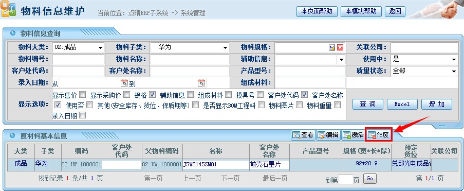 点晴模切ERP成品/原材料/模具资料维护—作废成品/原材料/模具