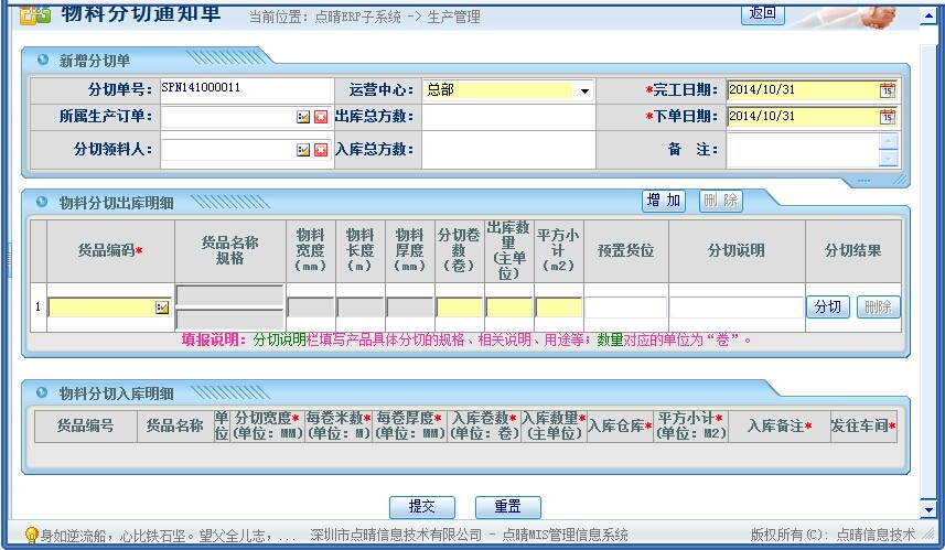 点晴模切ERP仓库管理—物料分切管理之新增分切通知单