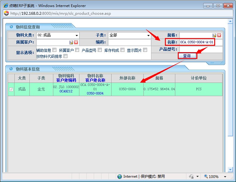 2、点击物料编码下的方框选择物料;点开后出现物料选择页面;如下图所示: 注:可用物料名称快速定位,也可使用其他信息定位查询。