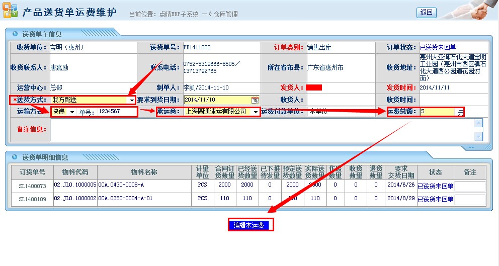 录入步骤:选择送货方式——选择运输方式——填写快递单号——选择承运商——填入运费——点击编辑本运费——