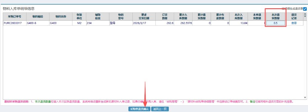然后出现如下图所示页面,点击查询。选好对应的物料信息,勾上对应的退货数量,点击下方的“提交拣货数量”: 填好物料并确认退货数量之后,点击“采购单退货确认”完成操作。 ![]() 点晴模切ERP更多信息:https://moqie.clicksun.cn,联系电话:4001861886 该文章在 2026/3/26 14:34:16 编辑过 |