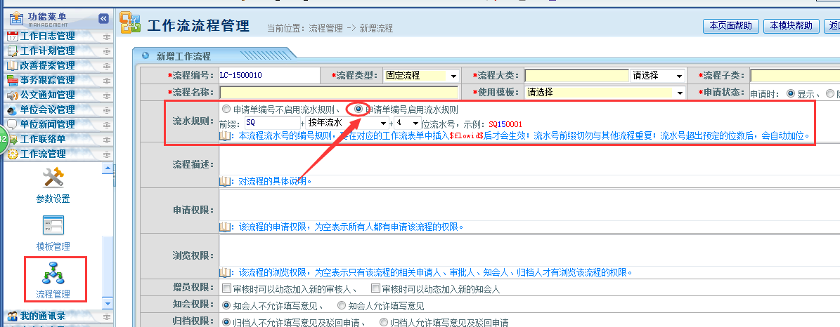 原因:2015年2月25日的升级包,工作流模块添加了“自定义启用流水号”的功能;