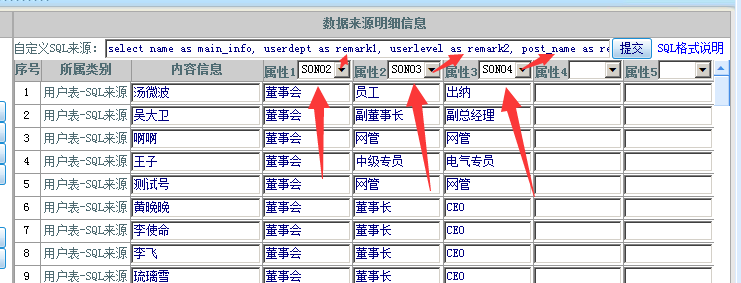 select *** as main_info, *** as remark1, *** as remark2, *** as remark3, *** as remark4, *** as remark5, *** as order_sort1, *** as order_sort2 from *** where **** and id='$oabusyuserid$' and product_name='$CS4$' and price>$SON01合计$ and **** 上面红色部分是必须有的,并且主字段必须重命名为:main_info; 后面的 remark1, remark2, remark3, remark4, remark5, remark6, remark7, remark8, remark9, remark10, remark11, remark12, remark13, remark14, remark15, remark16, remark17, remark18, remark19, remark20 (最多支持导出20个)是辅助输出字段,如果在后续调用时无需使用或需要部分使用的话,就可以留空全部或者保留需要的字段,注意,如果使用了嵌套查询/子查询,嵌套中出现的remark1~20字段也要加在最外层的select中;