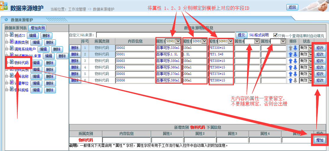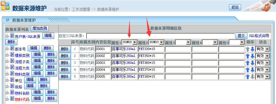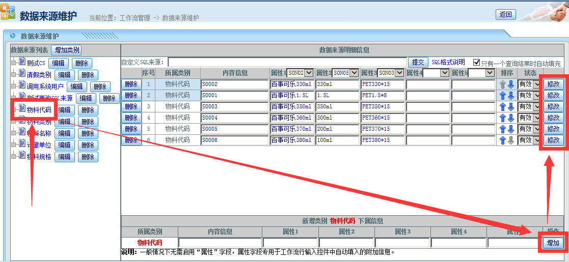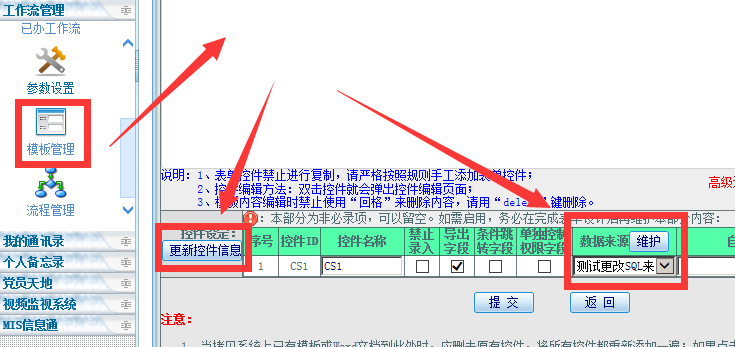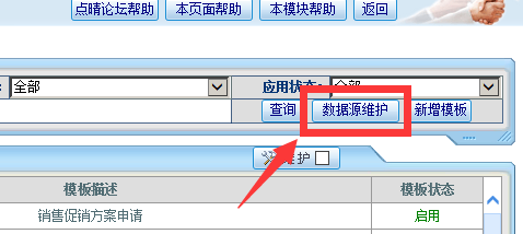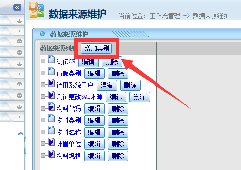 一、定义数据源类别: 点击“模板管理”或“流程管理”,找到“数据源维护”,增加数据源类别: