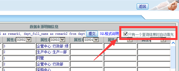 采用以上两种方法添加数据源时,需要注意如果查询结果只有一个的话,系统默认会自动完成填充反写到申请表对应的字段,无须用户再次点击。如果觉得不方便,管理员也可以不勾选该项目: