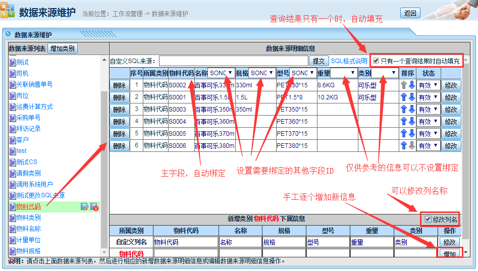 ![]() 注意:视频中的物料代码、物料名称、物料规格三列数据都是自动填充的,这个就是自定义SQL数据源的典型应用场景。