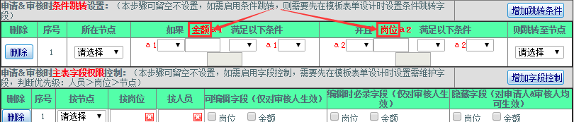 在表单模板中勾选了条件跳转字段后,在对应的流程设计中,点击“增加跳转条件”按钮,就会出现如下图所示效果,然后设置跳转条件即可: