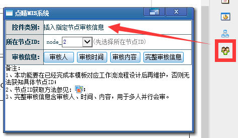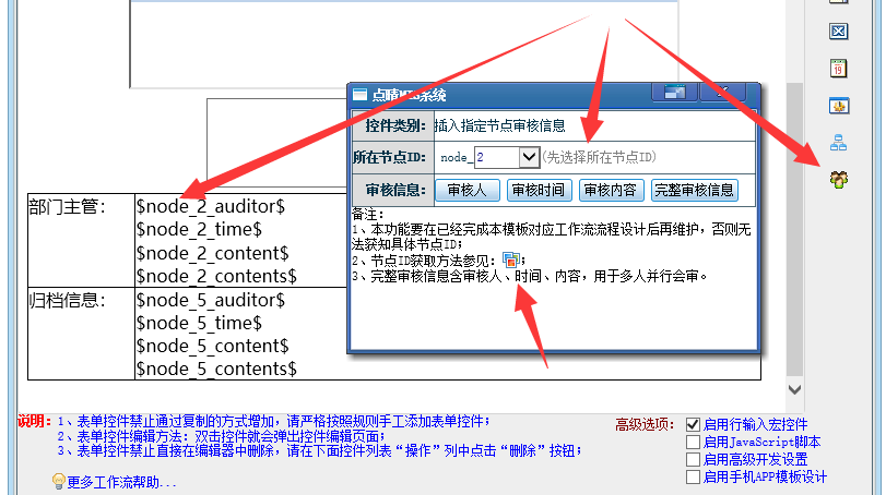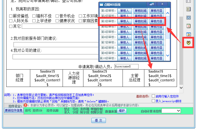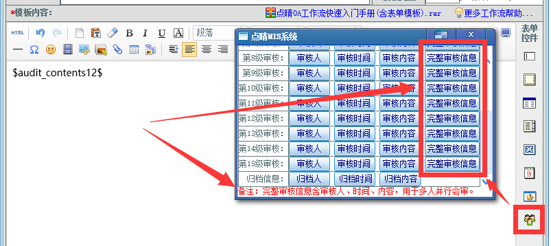 、按照审核人所在层级设置审核信息打开工作流管理-》模板管理,新建或者编辑现有表单模板,然后点击右边最下面那个图标,将审核人、审核时间、审核意见分别插入表单模板中适当位置即可: