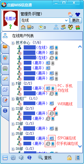 20151112更新增加点晴MIS信息通PC客户端和手机APP状态显示,方便用户间更便利的沟通: ![]() 注意: 1、以上WEB登录、PC端、手机APP端状态的显示是系统自动判断识别的,无需用户手工转换; 2、WEB或PC方式登录点晴OA,可以更改在线状态说明: ![]() 该文章在 2015/12/2 8:27:28 编辑过 |