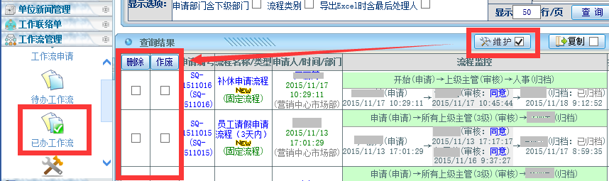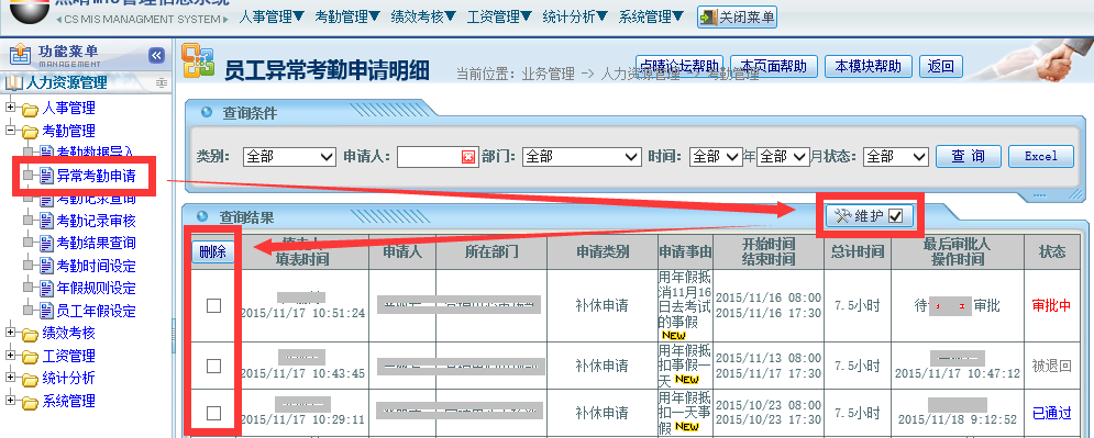 如果是考勤类的工作流申请,那么必须以网管身份进入点晴OA系统-》业务管理-》人力资源管理-》考勤管理,打开异常考勤申请,点击“维护”,找到需要作废的申请,删除即可。