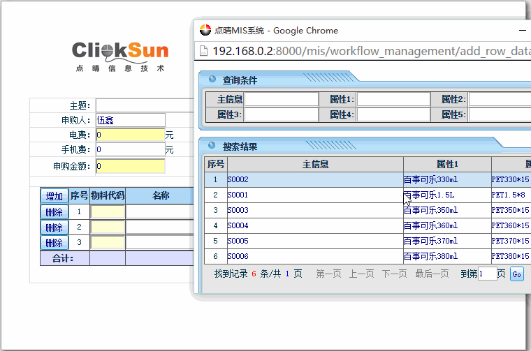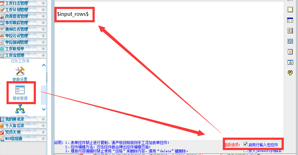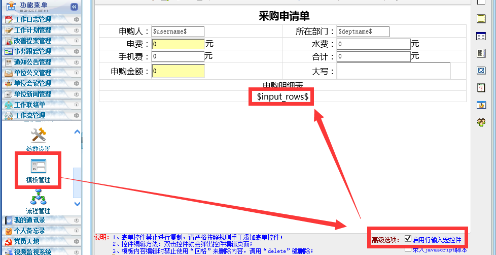 :问下,要做一个采购申请的模板,有没有如果明细部分行数不够可以由申请人自己添加的功能?并且希望实现部分控件禁止录入、禁止为空、显示合计、自动转换大写金额、设置预置数据以便选择等效果。![]() 可以,利用点晴OA系统工作流表单模板中的行输入宏控件,可以方便的实现采购单等需要填报多行信息的需求。 效果展示视频: 附件:工作流行输入宏控件效果展示.wmv ![]() 进入工作流模块,新增模板或编辑模板: 勾选“启用行输入宏控件”,就会在模板编辑器中看到增加了一个“$input_rows$”,这个就是行输入宏控件,将它挪到需要填写的适当位置。 然后维护这个行输入宏控件中各个列字段,通过适当的使用数据源功能,可以实现多个字段的自动填充、禁止录入等,无需用户手工填写: ![]() 在上面“数据来源”列,可以绑定预置数据,绑定数据源方法参考下面教程,可以实现用户点击时,自动弹出页面选择预置的内容,也可以设置“禁止录入”实现允许或禁止用户更改内容: 下面是用户申请采购单时的效果: ![]() 更多详细操作帮助参见: