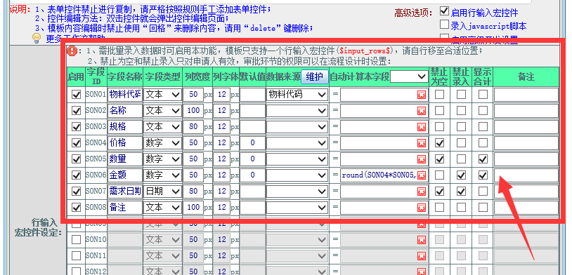 工作流表单模板如何实现控件禁止录入、为空,添加无限行输入宏控件来实现采购单等?支持设置下拉框来方便用户选择预置数据吗?