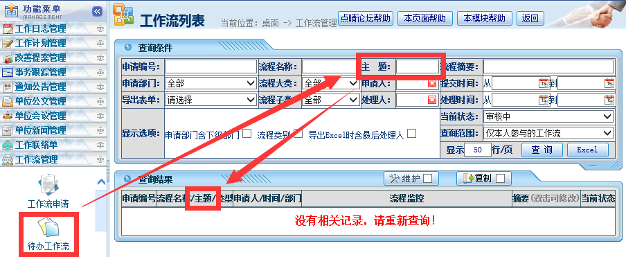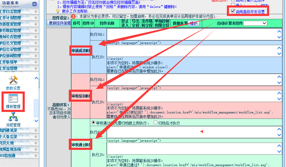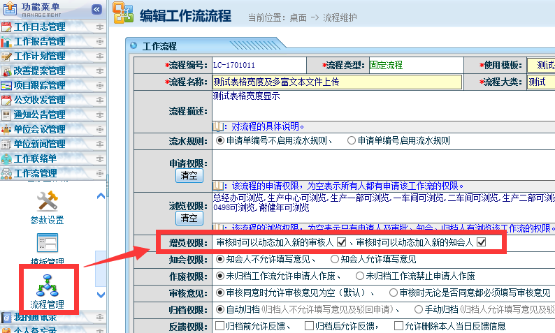 工作流模块进行了多项升级: a. 增加了“申请人的代理人”、“上一步指定审核人”、“上一步指定知会人”三个特殊岗位,可以实现更加灵活多变的流程需求; b. “申请人”这个特殊岗位不再限于审核节点,可以用于审核、知会和归档等所有节点; c. 开放了“归档”节点,允许流程中加入多个“归档”节点,方便用户在一个流程中兼容多种情况,例如请假时,根据申请人所在部门,跳转到不同的考勤管理归档人; ![]() 注意: 上一步指定知会人,可以指定多个人。 ![]() 注意: 上一步指定审核人,只能指定一个人,不能指定多个人。 如果需要所有步骤都支持动态增加知会人和审核人,那么在流程设计页面上勾选允许审核时动态加人即可: ![]() d. 工作流模板增加了“流程主题”宏控件,管理员设计流程表单时,可以插入这个宏控件,就可以在申请表中填入流程主题,并在工作流列表中看到这个主题字段了,也支持导出到Excel: ![]() 流程主题查询和Excel导出: ![]() e. 增加了工作流模板高级设计功能,支持自定义SQL、JS等多种操作、并且支持在其中插入工作流表单字段,可以将工作流审核结果直接影响点晴OA其他模块(例如新员工入职审批结果直接在系统中生成新员工、离职员工审批结果直接禁用其账户)、甚至直接更新其他第三方信息系统。
