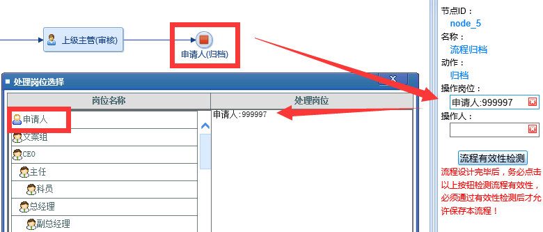 工作流程的申请人是按岗位做的,一个岗位有多个员工,流程完成后归档也是按岗位归申请人的,怎么做到申请人和归档人一一对应。。![]() 网管在设计该工作流流程的时候,注意归档节点可以增加一个特殊的岗位:申请人,就可以实现归档人就是申请人了: ![]() 另外注意,同一个工作流中也支持插入多个归档节点,各个归档可以通过审核时条件跳转自动绑定不同的归档人。