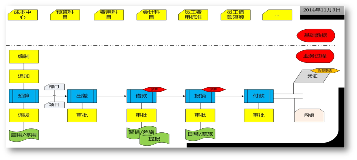 项目前期准备工作有三大结构:事项、项目、产品线等,支出费用结构(差旅费、采购费、日常费、接待费、宣传活动费、专项费等)、会计科目体系,六个关键因素:归口(事项管理部门、预算归口部门、受益部门等)、程序(项目区别、产品线区别、超预算与否区别、额度标准区别等)、流程(审批流)、标准(费用明细标准,人均、级别均等)、预算(项目、产品、费用科目)、单据(承载体) 总体规划、分步实施