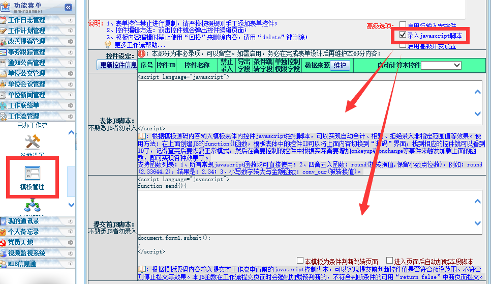 点晴OA系统工作流模板支持javascript脚本吗?如何设置启用操作?