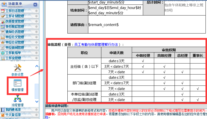 :如何修改点晴OA系统工作流考勤申请中的《员工考勤与休假管理暂行办法》? 点晴OA系统工作流考勤申请中的《员工考勤与休假管理暂行办法》是通过修改对应的工作流申请表单模板来修改的,在以下位置找到对应的表单模板,将使用单位的相关管理制度电子版上传上去即可: ![]() 注意:如果不熟悉点晴OA工作流运作原理的话,就只允许修改以上说明部分,切勿修改以上表单申请填写控件部分,否则将会导致工作流报错!