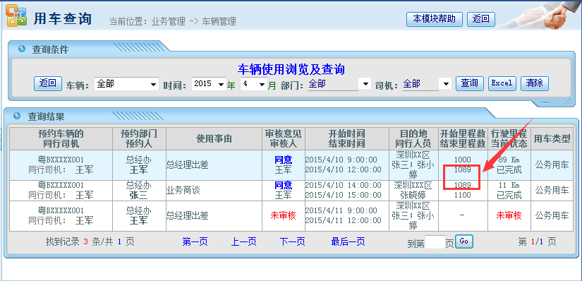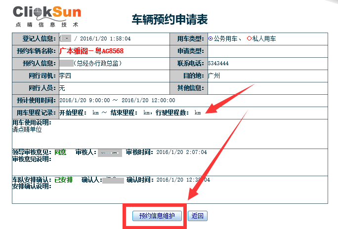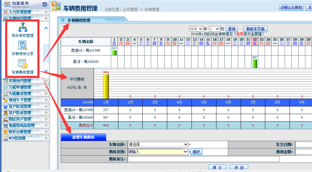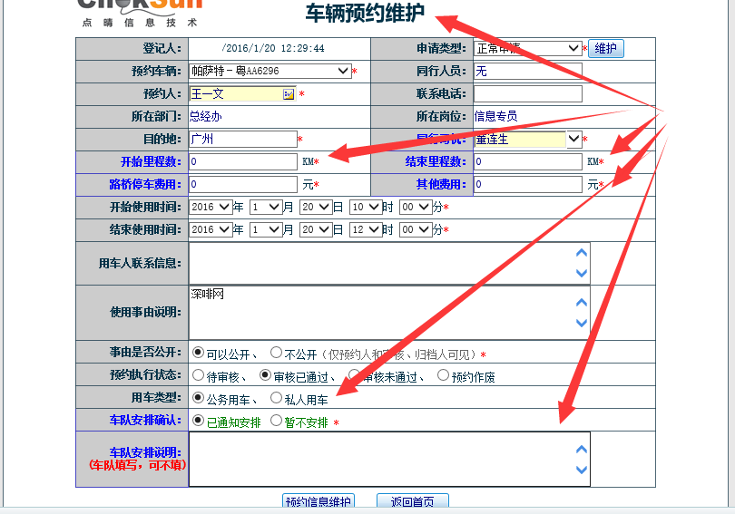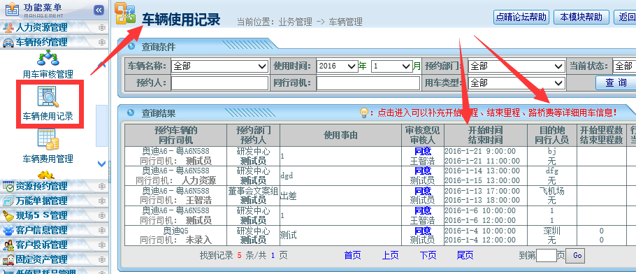 ![]() 也可以在工作流中,点击工作流申请,找到车辆预约管理: ![]() 申请完毕后,该申请就会按照设定的工作流进行审批了。 审批完毕后,就会进入到第二个环节:车辆调度安排。 、车辆调度安排 先要确保已经按照上述设置在权限管理中开放车辆安排权限给车队调度员了,必须有安排车辆权限才会看到下面的“待安排车辆”栏目: ![]() 找到需要调度安排的车辆,安排完毕后,系统会自动后台发送EMail通知该用车的申请人。 用车完毕后,车队应该将用车信息(开始和结束里程、路油费等)录入系统中。 用车信息维护![]() 找到本次用车申请单,录入用车相关信息(开始和结束里程、路油费等): ![]() 注意事项: 1、如上图箭头位置所示:同一辆车前一次的里程结尾记录与后一次里程开始记录需一致。 2、若一次用车里程差别较大,则需找用车人的责任(比如根据填写的目的地判断,本来10公里的路程,里程显示走了80公里)。 车辆管理以上功能可以有效解决如下问题: 1、避免公车私用的现象出现; 2、避免车辆管理资金无法追查的现象。 3、车辆资源能有效的分配。 用车信息查询![]() 车辆费用分析![]() 该文章在 2016/8/31 14:43:52 编辑过