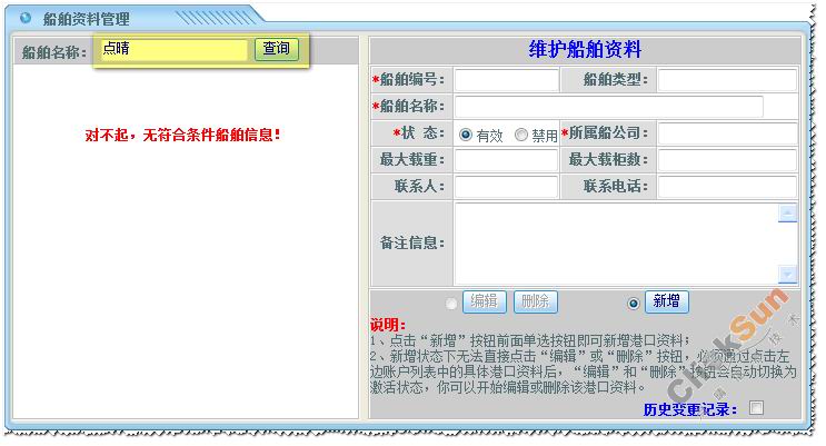 在添加船舶信息之前,请先查找系统上是否已经存在相应的船舶名称,再确定是否需要增加船舶信息。如:需添加船舶名为“点晴”,先查找“点晴”,系统显示找不到相应记录,再进行新增船舶信息。