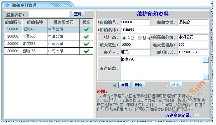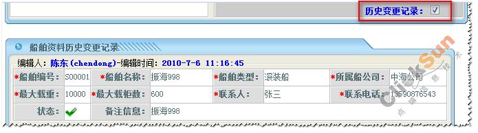 在船舶信息列表中,点取某一船舶名称,右边维护资料方块则显示了所选取的船舶详细信息。 修改船舶的信息,然后点击【编辑】保存修改信息。 点击【删除】删除所选取的船舶信息。 3、查看历史变更记录