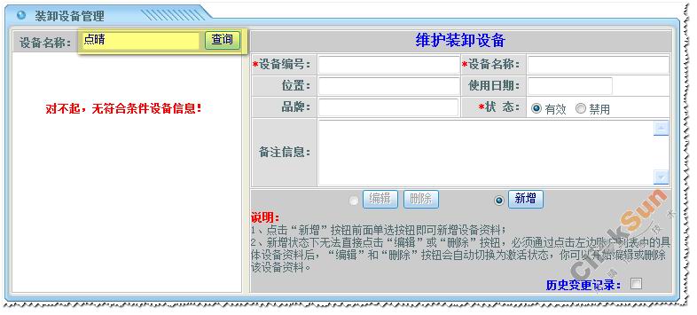 在添加装卸设备信息之前,请先查找系统上是否已经存在相应的装卸设备名称,再确定是否需要增加装卸设备信息。如:需添加装卸设备名为“点晴”,先查找“点晴”,系统显示找不到相应记录,再进行新增装卸设备信息。