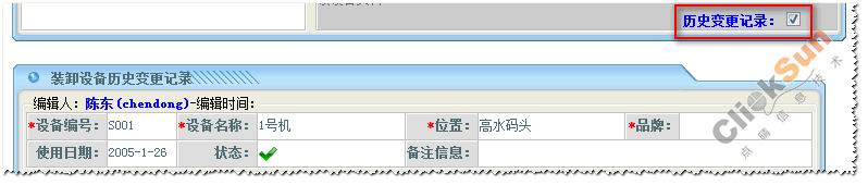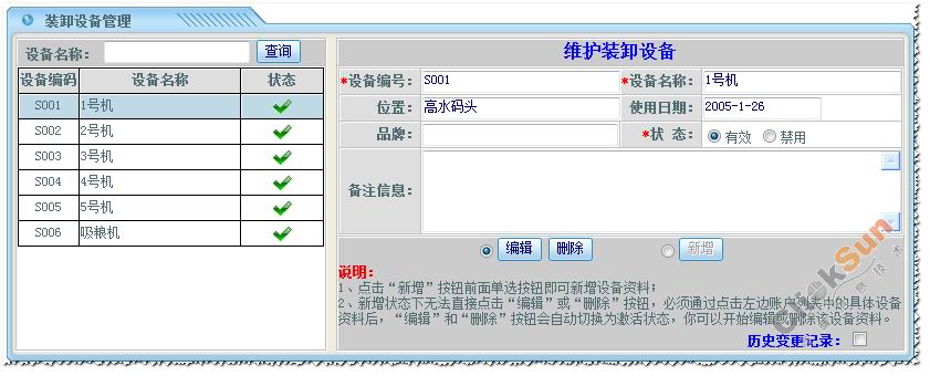 在装卸设备信息列表中,点取某一装卸设备名称,右边维护资料方块则显示了所选取的装卸设备详细信息。 修改装卸设备的信息,然后点击【编辑】保存修改信息。 点击【删除】删除所选取的装卸设备信息。 3、查看历史变更记录
