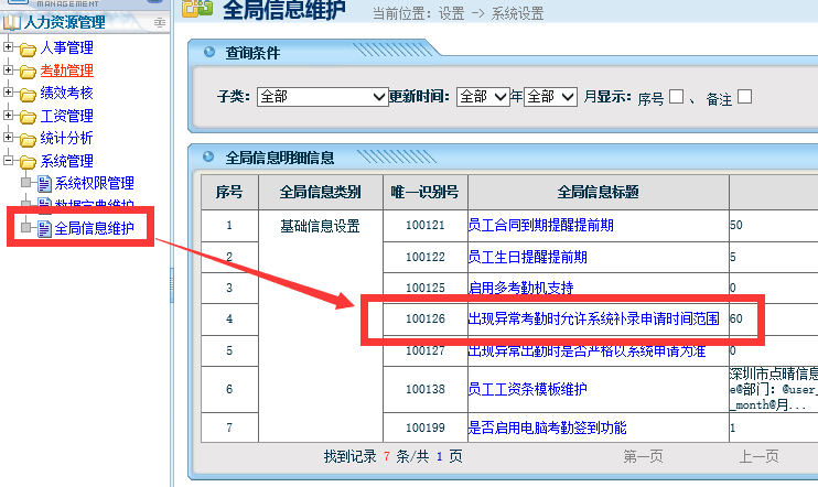 :点晴OA提示按照本单位相关制度规定,禁止对60日以前的异常出勤进行申请!如特殊情况,你仍可以委托人事专员修改考勤明细。参考帮助码:16030101,如何解决?![]() 进入点晴OA-》业务管理-》人力资源管理模块,可以修改该时间: ![]() 在“全局信息维护”中找到以下项目更改即可: ![]() 该文章在 2018/9/4 22:05:18 编辑过 |