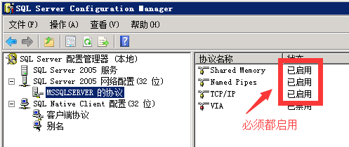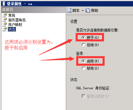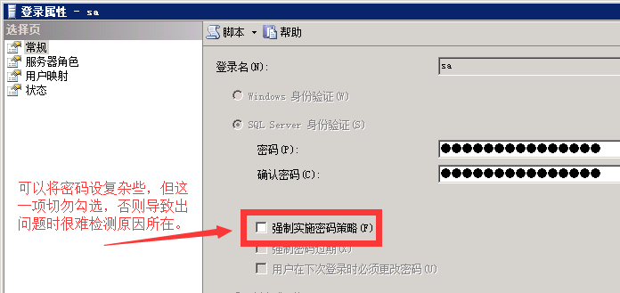 进入点晴OA服务器,打开:开始-》所有程序-》Microsoft SQL Server 2005/2008-》SQL Server Management Studio,身份验证选择“Windows 身份验证”,然后点击“连接”: ![]() 进入后检查如下设置: 1、检查是否开“ SQL Server 和 Windows 身份验证模式” ![]() ![]() 一定要选择“SQL Server 和 Windows 身份验证模式”,切勿选择为“Windows 身份验证模式” 2、检查管理员账号sa是否连接数据库并开启了允许远程登录: ![]() ![]() 不要勾选“强制实施密码策略”,否则后续出现错误,很难查原因,管理员可将这个密码设置复杂些 ![]() 这两项必须分别设置为:授予和启用 3、打开OA服务器“开始-》所有程序-》Microsoft SQL Server 2005/2008-》配置工具-》SQL Server Configuration Manager(SQL Server配置管理器)”: ![]() 必须启用:Shared Memory、Named Pipes、TCP/IP这三项 ![]() 必须启用:Shared Memory、Named Pipes、TCP/IP这三项 4、然后重启SQL Server: ![]() 5、启动完毕之后,再试试sa能否正常登陆: ![]() 弹出以下界面: ![]() 然后点击“连接”,现在应该可以正常登陆SQL Server数据库了。如果不行的话,回头重新检查所有参数,必须通过才行。 相关教程: 该文章在 2016/3/7 22:11:25 编辑过 |