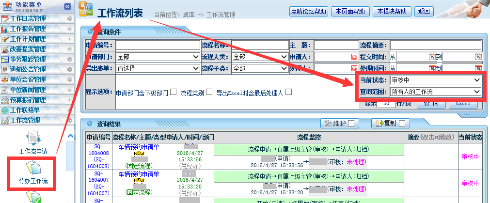 :请问点晴OA如何监控在执行中工作流申请的单据流转状态?未结案工作流要如何督办提醒尽快完成审核?![]() 工作流进度监控需要赋予特别的权限,才允许查看监控别人的工作流进度,这个权限不应该赋予给多个岗位或人,应该赋予专人来监控整个单位的工作流进度,权限设置位置如下: ![]() 有了以上权限后,进入工作流列表,状态选为:“审核中”,查询范围选为:“所有人的工作流”: ![]() 就可以看到当前所有执行中的工作流列表了,如果对耽误太久的工作流有疑问,点击进入后,直接点击“提醒审核人”按钮,系统就会自动以管理员身份发送系统提醒邮件给当前审核人。 ![]() 该文章在 2016/4/28 10:44:17 编辑过 |