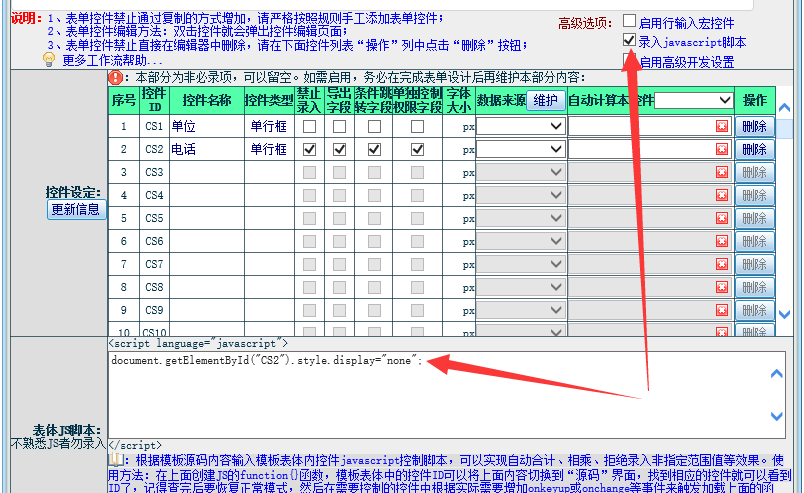 :点晴OA工作流设计时已经设置指定字段(单选框、下拉框、日期等宏控件)禁止录入,但申请人仍然可以点击选择(文本和数字控件可以正常生效),要如何处理?隐藏表单字段是否可行?![]() 正常情况下,管理员在设计工作流表单模板时,对于文本型、数字型等控件只要设置字段为禁止录入,即可控制申请人看到的是空白内容,而无法录入。 但对于单选框、下拉框、日期等宏控件,单纯的禁止录入仍然不足以控制申请人去点击这个控件,导致可以变相录入数据。为了避免此问题,可以在表单模板设计时,将指定的字段(宏控件)设置为强制隐藏,这样申请人申请时,就不会看到这个字段了,自然也就无法点击增加内容,可以彻底解决这个问题,实现方法如下: ![]() 注意,控制隐藏的JS脚本:document.getElementById("CS2").style.display="none"; 要放到“表体JS脚本”中才会生效。
