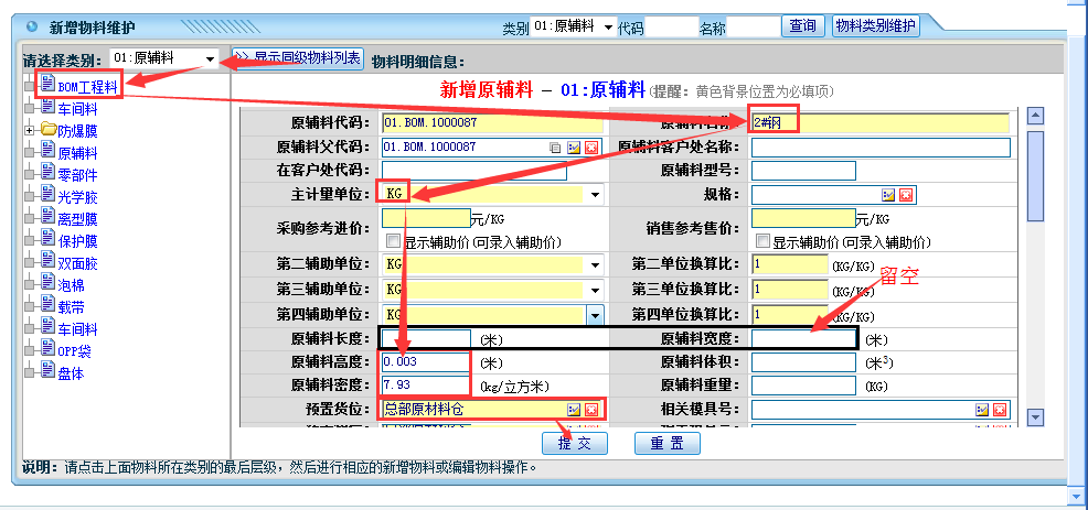 录入说明: 步骤:选择“原材料”——点击“BOM工程料”——填入原材料名称——选择主单位——录入原材料高度(厚度)——录入原材料密度——选择预置货位——点击“提交”完成。 注意:1、若有需要可录入原材料的采购单价; 2、材料长度与宽度留空即可。 视频链接: 附件:新增BOM工程料(五金).mp4 点晴模切ERP更多信息:https://moqie.clicksun.cn,联系电话:4001861886 该文章在 2016/5/12 15:59:50 编辑过 |