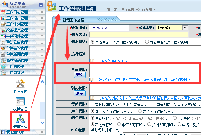 点晴永久免费OA工作流设计制作完毕后,在工作流申请中看不到,如何设置申请范围来控制使用部门或岗位?