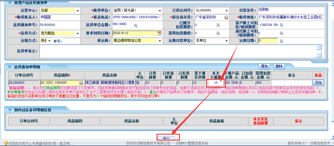 确定对应的送货信息,点击“提交”即可