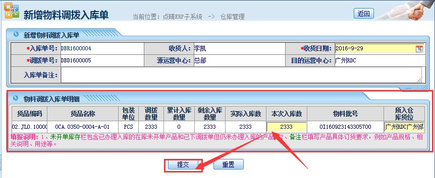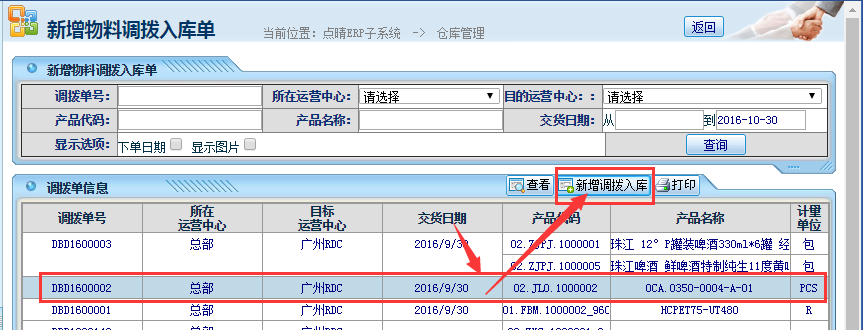 仓库管理——物料入库管理——调拨入库管理——新增调拨入库单——选择对应的明细——点击新增调拨入库按钮