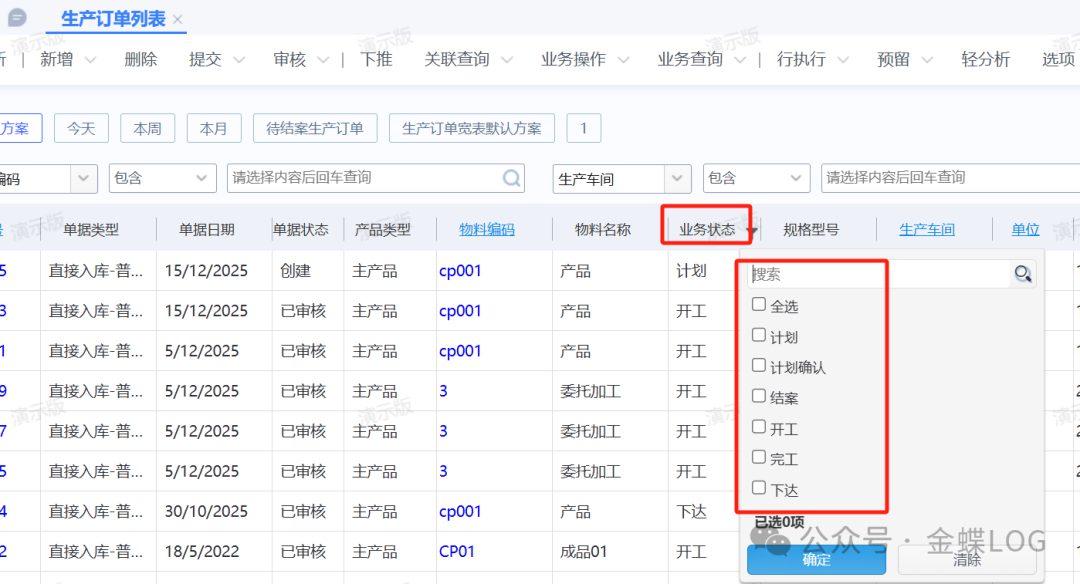 Q问题描述你是不是一直疑惑,生产订单的【业务状态】字段这么多值,分别都是表示什么意思呢?A问题解答首先生产订单里面业务状态一共有7个值;分别是:计划、计划确认、下达、开工、完工、结案、结算。分别表示什么意思?一、计划在新增生产订单的时候,系统默认值就是‘计划’状态;在工单未审核前状态都不会改变。这种状态不能下推领料入库...