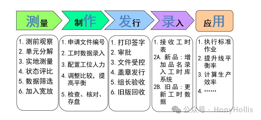 主题:探标准工时制作流程测量测前观察单元分解实地测量状态评比数据筛选加入宽放制作申请文件编号工时数据录入配置工位人力调整比较,提高平衡检查、核对、存盘发行打印签字审批文件受控盖章发行组长验收旧版回收录入接收工时表A.新品:增加品名录入工时库系统B.旧品:更新工时数据应用执行标准作业提升线平衡率计算生产效率.……Step...