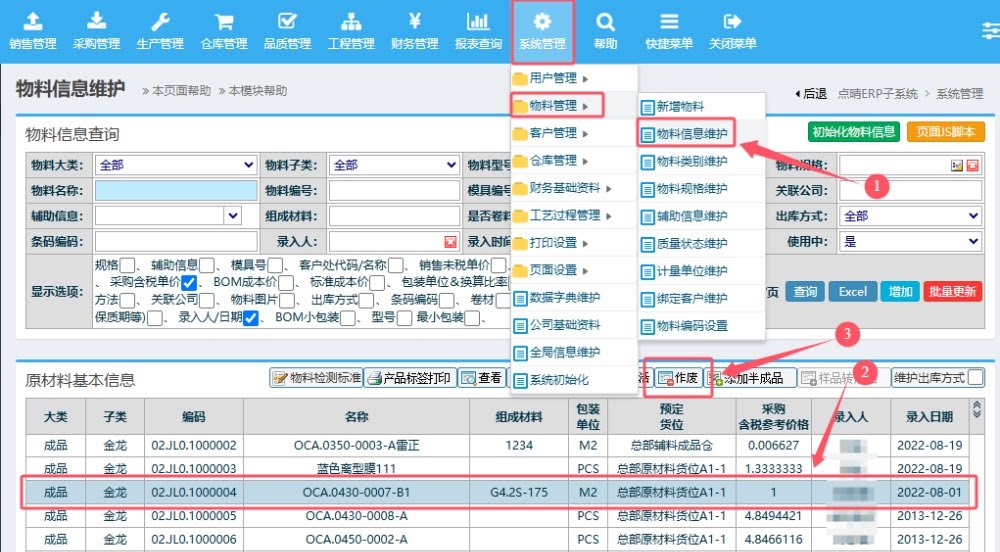 操作步骤:系统管理——物料管理——物料信息维护;用筛选条件查询到对应的资料:如下图示: