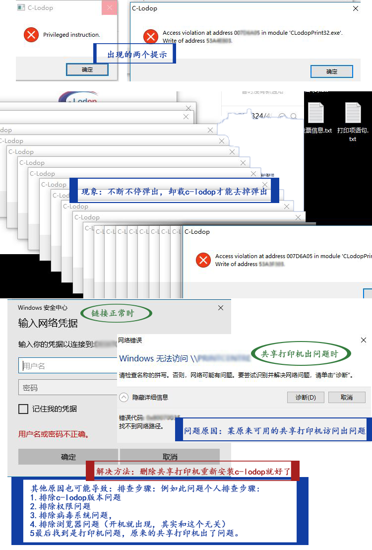 说道最近打印机,也就是这个共享打印机,然后我进网络里查看了下,这共享打印机出了问题,访问不了了,正常情况应该会有用户秘密提示,但是其他同事测试c-lodop注册号中午重装了系统,所以共享打印机出了点问题。然后我删除了该共享打印机,然后再安装c-lodop,不再有这个弹窗了,正常了,所以这问题是共享打印机连接出问题导致的。