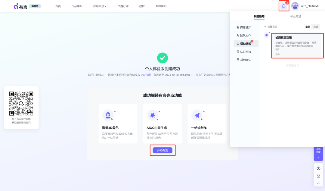 注册登录成功,目前注册成功后平台赠送900言币,有效期为14天,需尽快完成试用体验哦。