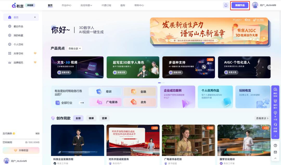 进入有言3D数字人视频生成首页,点击右上角【新建作品】。